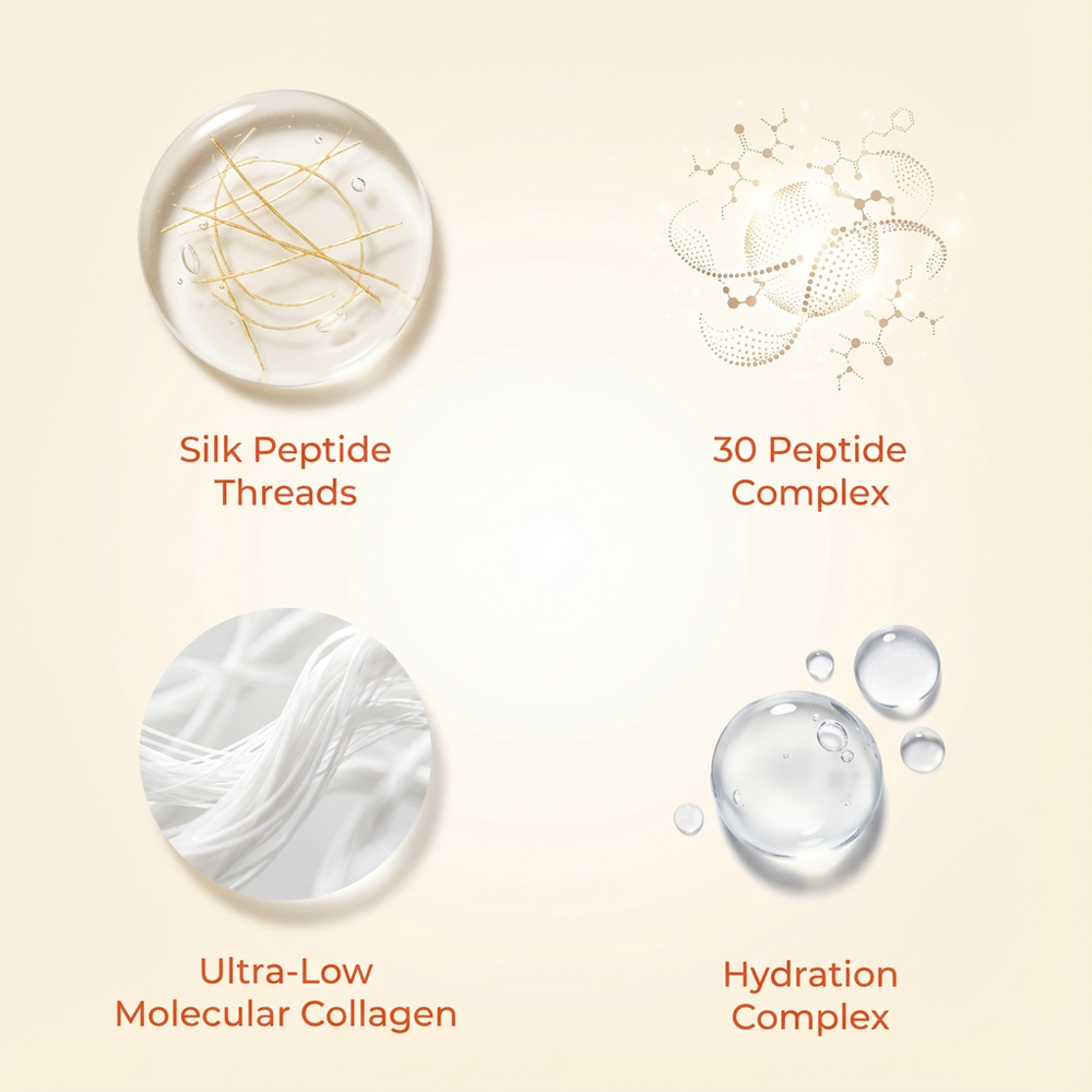 Silk peptides are bioactive amino acid chains extracted from natural silk protein. With an exceptionally small molecular size, they can penetrate the skin's dermal layer more effectively than conventional anti-aging ingredients.
