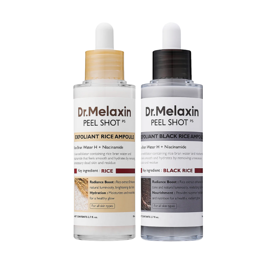 Powered by premium Korean rice extracts and advanced exfoliation, our dual-action ampoules with White Rice + Black Rice cleanse pores, smooth texture, and brighten skin—without irritation. For hydration, exfoliation, and radiance, the Peel Shot Glow Duo is in a league of its own.